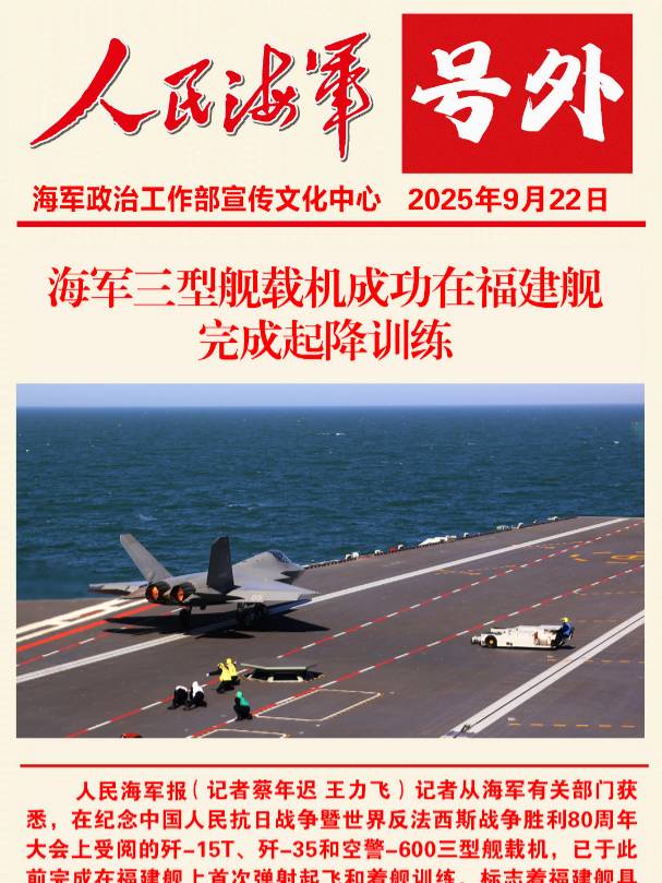 記者從海軍有關部門獲悉,在紀念中國人民抗日戰爭暨世界反法西斯戰爭勝利80周年大會上受閱的殲-15T、殲-35和空警-600三型艦載機,已于此前完成在福建艦上首次彈射起飛和著艦訓練,標志著福建艦具備了電磁彈射和回收能力。這是我國航母發展歷程中取得的又一次突破,對推進海軍轉型建設具有里程碑意義。